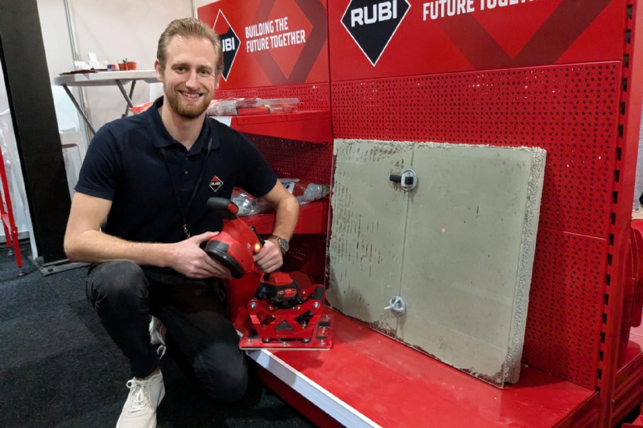 Roy Ansems van RUBI Benelux presenteert de RUBI Quake. Met dit apparaat kun je lijm gelijkmatig op tegels aanbrengen. Zo voorkom je dat er lucht tussen de tegel en lijmlaag komt wat voor breuk kan zorgen bij kou. Op de linkerkant van de tegel op de foto is lucht te zien, terwijl de rechterkant met de RUBI Quake is bewerkt en er geen lucht te zien is.