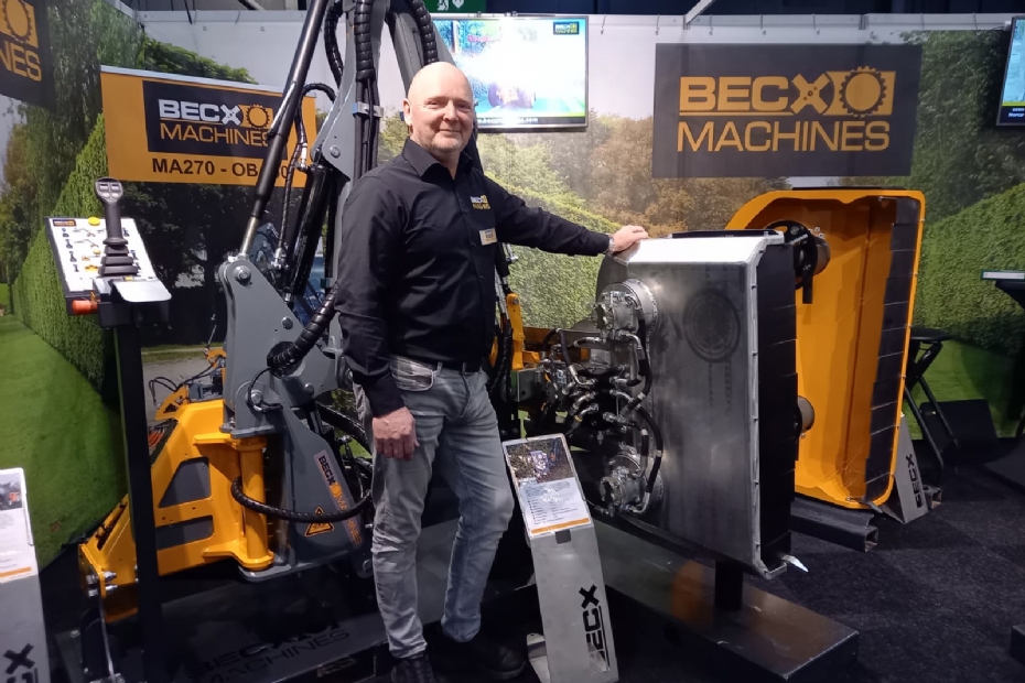 Erwin Hommen staat bij Becx Machines op de stand met het prototype van een nieuwe snoeier: de HS 100 HR. De snoeier is een meter werkbreedte en compleet van lichtgewicht aluminium. Wanneer kunnen we deze relatief kleine machine verwachten? 'Het streven is voor de eerste snoeironde, dus rond mei. Dat is snel, maar maak je geen zorgen, ik heb hem getest en hij doet het!' De snoeier werkt net als de andere snoeiers van 75 cm en 130 cm.