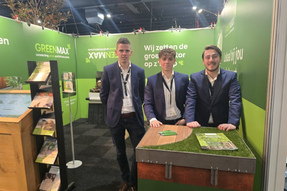 Sjoerd Hagen, Roeland van Os en Robin Driessen van GreenMax introduceren de SmartEdge. Een nieuwe Nederlandse flexibele kantopsluiting voor hoveniers. Daarnaast hebben ze ook de Aquaraft, een waterbuffer krattensysteem van LDPE voor daktuinen.
