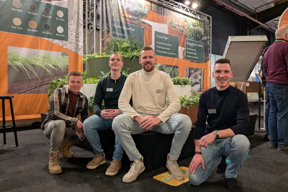 Jan van Gessel, Timo Baaij, Rowin Verhoog en Aris Willemsen van Straightcurve zijn erg tevreden over hun beursdeelname: 'Gister was in elk geval een heel leuke dag vol goede gesprekken. Dat moet vandaag ook lukken. We staan hier om de nieuwe colorline te presenteren en onze naamsbekendheid te vergroten. We merken dat steeds meer hoveniers onze producten weten te vinden', zegt Aris. 'Na elke beursdeelname krijgen we er weer wat klanten bij.'