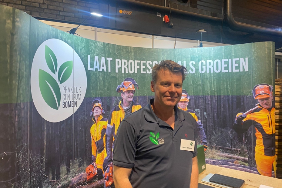 Aan het begin van de hal valt hij al op: de bomenlift bij PC Bomen. 'Vorig jaar stonden we hier ook al mee op de beurs,' vertelt Peter Bongen. 'Maar ook dit jaar doet hij het weer goed.' De opleider uit Apeldoorn heeft het doel een specifieke training op te zetten voor de bomenlift om zo meer ruchtbaarheid te geven.