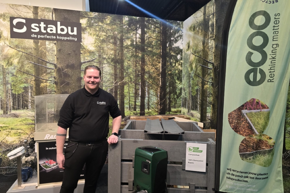 Raoul Leijtens van Stabu uit Oirschot, op de beurs met name voor Ecoo, met 100% gerecyclede producten voor hoveniers in de tuin. Stabu is een technische groothandel.