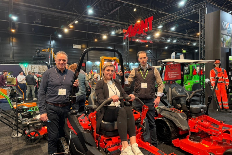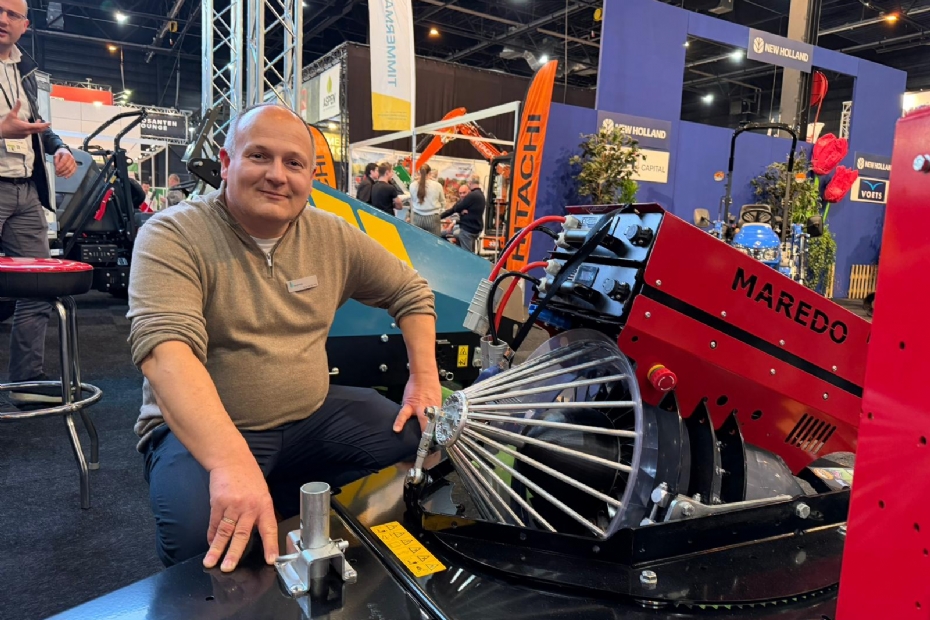 Arne van der Valk van Heybroek met de nieuwe Maredo cyclone bladblazer met een capaciteit van 150 kuub per minuut. Volledig electrisch en binnenkort start een demotour, maar de eerste blazers zijn al verkocht op de beurs.