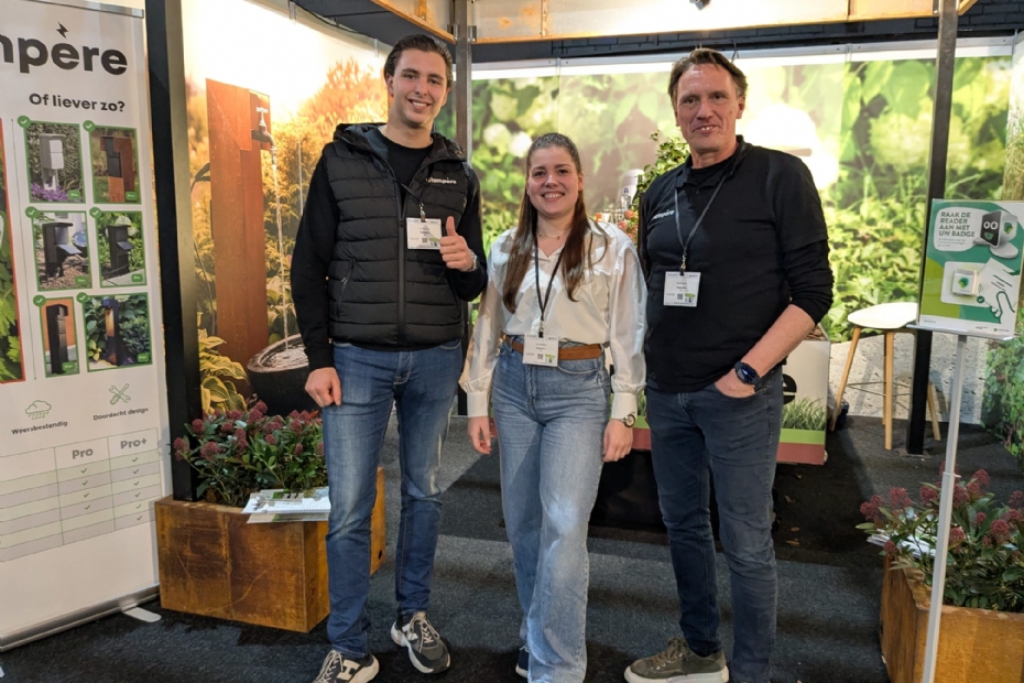 Lars Heerkens, Laura Willens en Ton Willemse van Glampère hebben iets heel bijzonders op hun stand. Het gaat om een 'meegroeibare spothouder'. Dit systeem kan in een laag beplante tuin worden geplaatst en is in de hoogte verstelbaar, zodat de verlichting met de beplanting meegaat. Ook kan de sterkte van de verlichting worden aangepast, zodat een object of boom naar keuze verlicht kan worden. Er wordt ook rekening gehouden met de biodiversiteit rond de spothouder. 'Het licht is niet te wit, zodat egels in de tuin er niet door worden afgeschrikt', zegt Ton. 'De spothouder heeft nog geen officiële naam en is ook nog niet op de markt gebracht. Je ziet hier in feite een try-out. De reacties zijn positief. Een groot voordeel van dit systeem is dat de bekabeling in het ontwerp is verwerkt. Er steken geen kabels uit die per ongeluk doorgeknipt kunnen worden.'