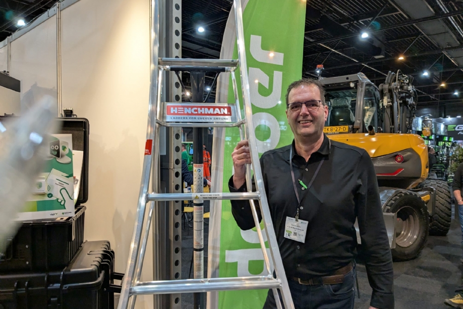 Corne van de Bout van De Boer staat met twee innovaties in Hardenberg. Onder meer met de brandwerende kluis Safe Charge 1 van De Raat en met de Henchman. Laatstgenoemde innovatie is een lichtgewicht trap met drie poten die slechts 12 kilogram weegt. 'Er is heel veel interesse in die trap. Het is een stabiel systeem waar je geen pijnlijke voeten van krijgt en die tot 4 meter hoog kan worden uitgeschoven. Je kunt hem hier uittesten en alle reacties zijn ontzettend positief', zegt Corne.