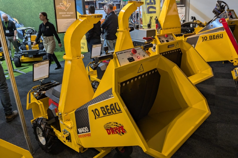 Jo Beau presenteert de elektrisch aangedreven M400 Drive houtversnipperaar met een vermogen van 20 pk en aangedreven door 2 cilinders, zodat takken tot 10 centimeter versnipperd kunnen worden. 'Het apparaat is voorzien van rij-assistentie en minimaal 3 uur autonoom rijden', stelt Menno Plooij.