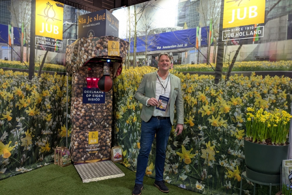 Otto de Voomen van Jub Holland presenteert op zijn stand de vernieuwde website van het bedrijf. 'Ook zijn we nu volop bezig met de zomerbloeiers die steeds populairder worden', vertelt hij. De stand van Jub Holland trekt veel bekijks, want er staat een boksbal opgesteld. 'Elke beursdag wordt er een winnaar uitgeroepen die het hardste kan slaan. We hebben veel kandidaten gehad', vertelt hij met een lach.
