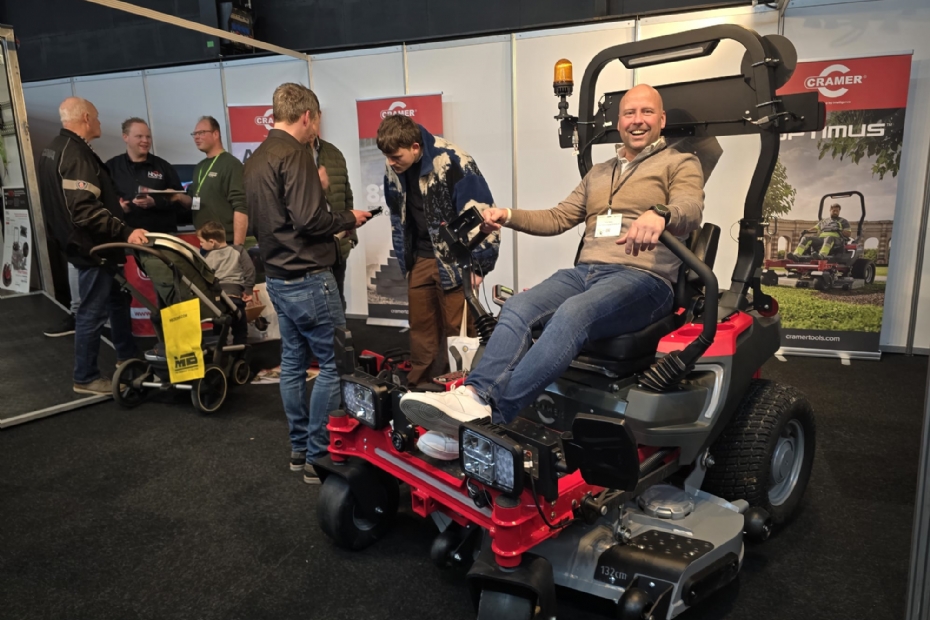 Emile Aalders van eurogarden staat met Cramer op de vakbeurs. Nieuw is de roadkit voor op de zitmaaier, een nieuwe aanhangwagen voor hoveniers en grootgroenvoorzieners en gemeentes. Zelf in te delen met zonnecollectoren en een hele grote batterij aan boord. Ook gloednieuw: een ruw terrein maaier, de Optimus ATM76 SC. Meer motorvermogen, zwenkwielen, parkeer rem, maar het meest unieke aan de machines is, dat er in de wielen electrische motoren zitten. Waardoor je makkelijker op een helling, ook achterwaarts omhoog kan!