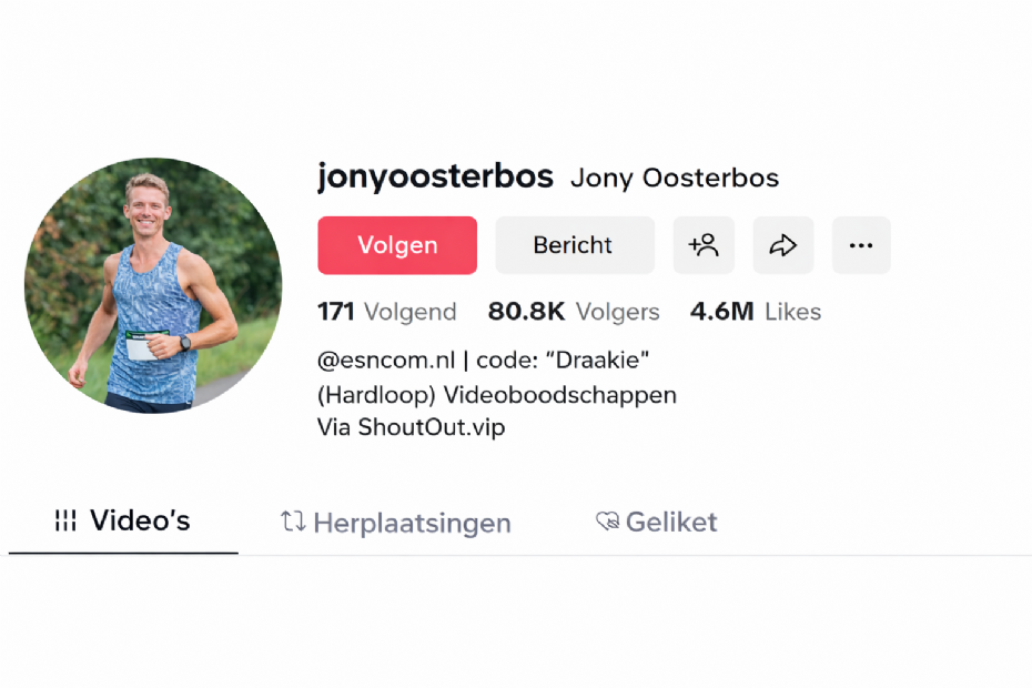 Overdag werkt hij als hovenier, in zijn vrije tijd loopt hij marathons. Met die combinatie heeft Jony Oosterbos (25) een groot publiek opgebouwd op social media. Onder de bijnaam 'Draakie' volgt een groeiende groep fans zijn hardlooprondes, wedstrijden en trainingen. Op TikTok heeft hij inmiddels zo'n 80.000 volgers, op Instagram ongeveer 35.000.
