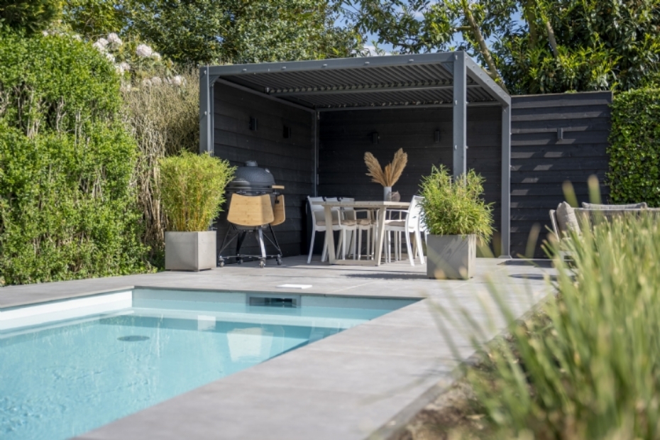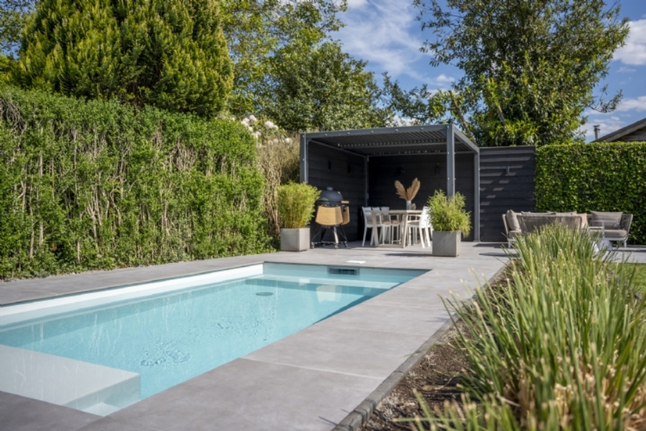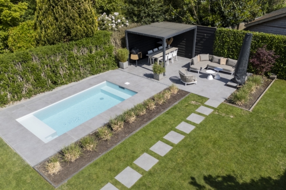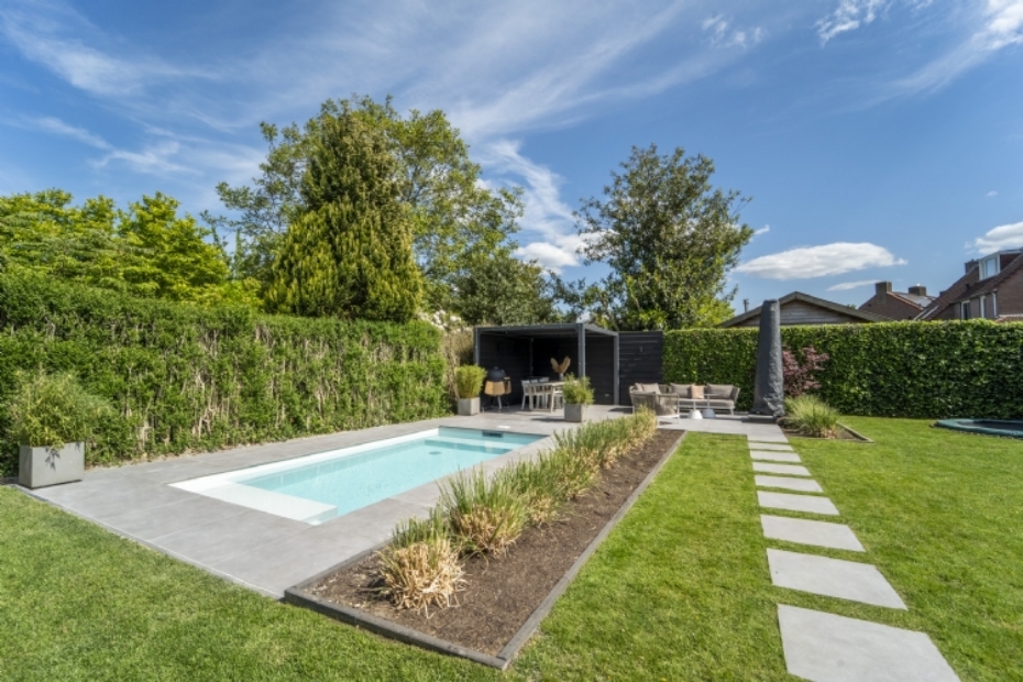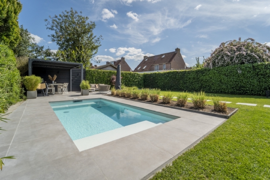 Redsun levert keramische bestrating voor gezinstuin met zwembad |