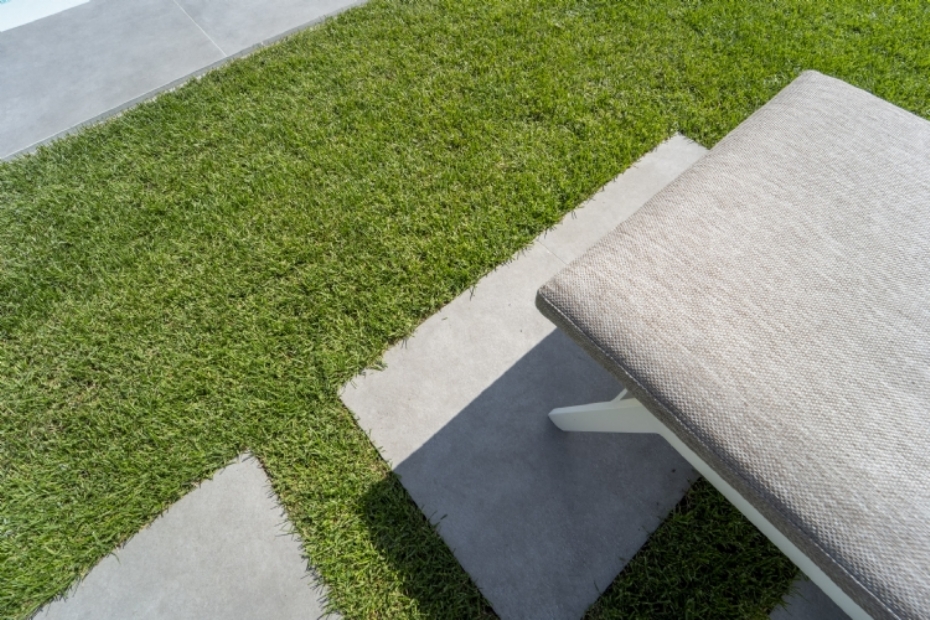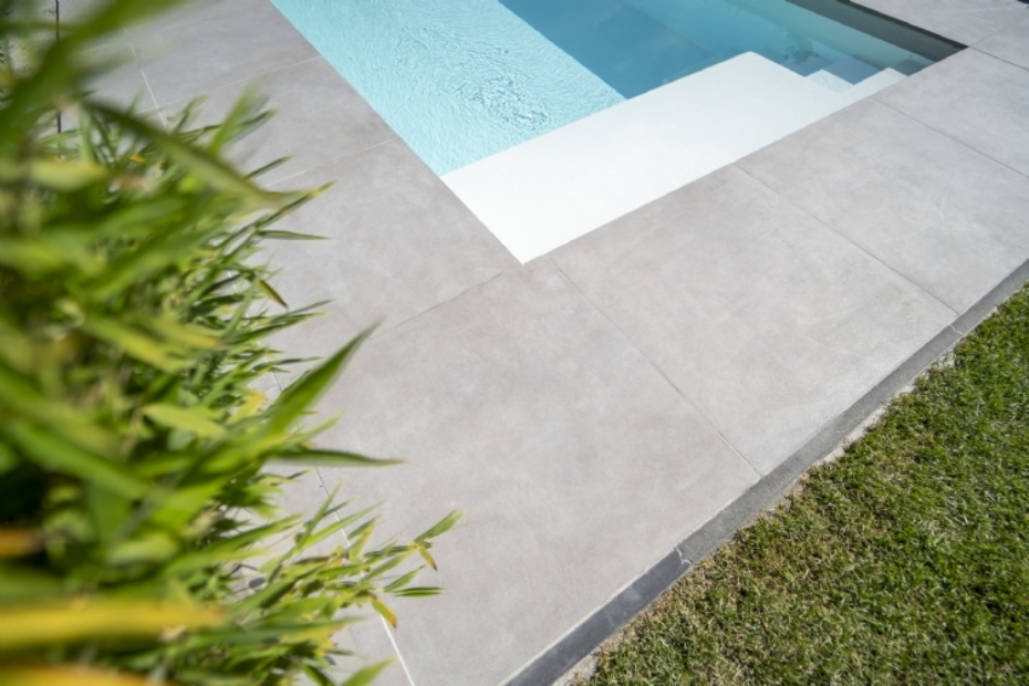 Rond het zwembad en op het terras zijn keramische tegels toegepast uit de Bari grigio-serie van Redsun, in het formaat 80 × 80 × 2 cm. Deze tegels zijn onderhoudsvriendelijk en slipvast, wat ze geschikt maakt voor gebruik rond water. Voor de looppaden is gekozen voor Bari grigio-tegels van 60 × 60 × 3 cm. Dit formaat zorgt voor een duidelijk verschil tussen verblijfsruimtes en looproutes en draagt bij aan een veilige en vlakke doorgang door de tuin.