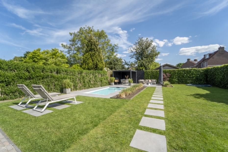 In deze tuin staat gebruiksgemak centraal, zonder dat dit ten koste gaat van uitstraling. De inrichting is gericht op rust en overzicht, met ruimte voor zowel ontspanning als spelen. De strakke lijnen van het zwembad en het terras geven de tuin een moderne basis. Het zachte kleurgebruik en de groene randen zorgen voor een warme en toegankelijke sfeer. Indiener van het project is Redsun.