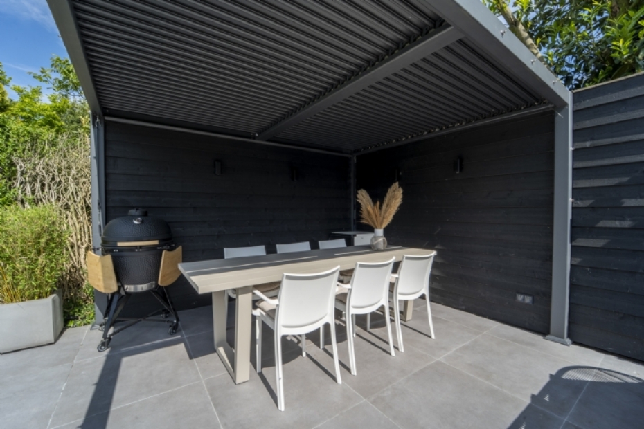 Goed zicht op de tuin Bij het ontwerp is rekening gehouden met gebruik door het hele gezin. De tuin beschikt over een ingegraven trampoline en voldoende gras om vrij te spelen. Vanaf het overdekte terras is er goed zicht op de tuin, wat zorgt voor extra overzicht en veiligheid.