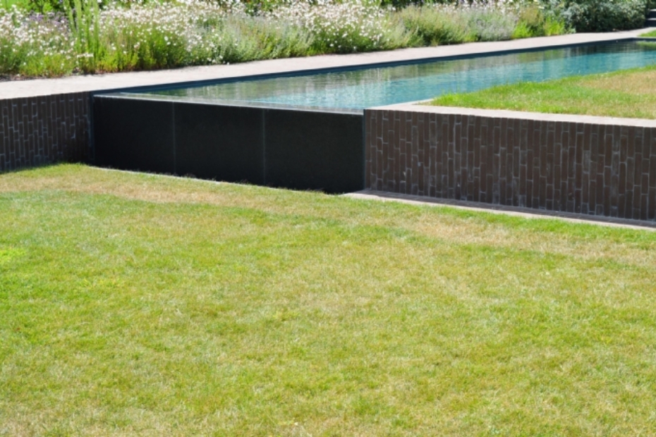 In een glooiend landschap is een particuliere tuin aangelegd met een duidelijke ruimtelijke opzet en een sterke relatie met de omgeving. In het project zijn straatbakstenen toegepast van Steenbakkerij Vande Moortel.