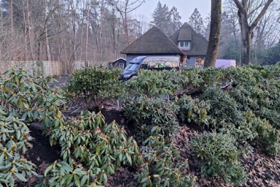 Bij een luxe villa in Uddel wordt in deze bostuin een Rhododendron wal aangelegd. Reinier de Ridder van hoveniersbedrijf ‘Tuinier’ uit Elspeet heeft maar liefst 300 Rhododendrons van Kwekerij De Buurte op deze wal aangeplant.