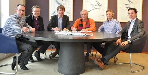 Foto: Erik Wijnbergen (voorzitter van de VTN) en Ties Joosten (directeur Kiwa Isa Sport) tekenen het contract in het bijzijn van de overige bestuursleden van de VTN (Peter van Hoof, Harry Pluim en Lourens Barmentloo) en de verantwoordelijke projectleider van Kiwa Isa Sport (Hans de Vries)