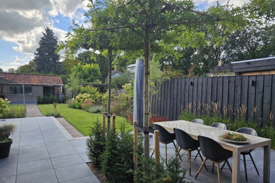 Naast gebruiksgemak speelde groen een belangrijke rol in het plan. De tuin is zo ingericht dat er een duidelijke balans is tussen verharding en beplanting. Daarbij is gekozen voor moderne materialen, gecombineerd met hergebruik van bestaande gebakken klinkers. Door deze opnieuw toe te passen, ontstond een samenhangend geheel waarin oud en nieuw op elkaar aansluiten.