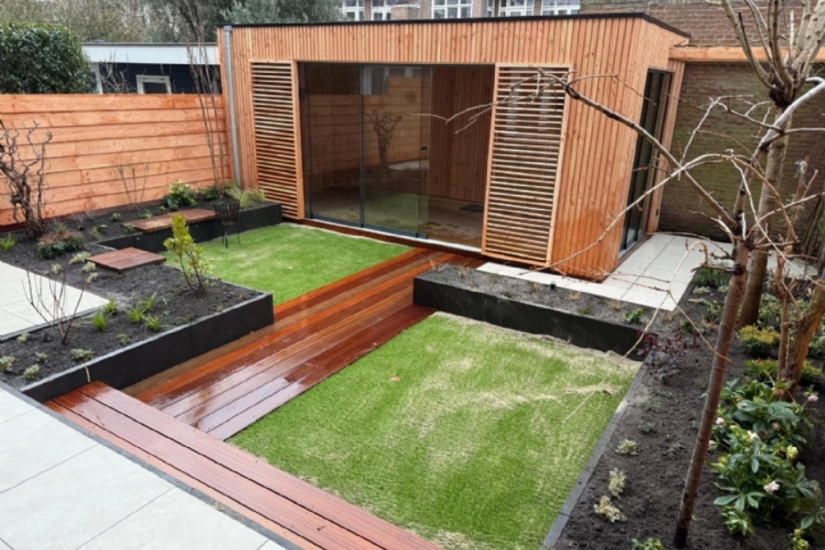 Verschillende materialen ingezet In de tuin is gewerkt met verschillende materialen. Er zijn keramische tegels toegepast in combinatie met een hardhouten vlonderpad en hardhouten zitbanken. Achter in de tuin staat een volledig geïsoleerde tuinkamer van douglashout. Deze is voorzien van vloer-, wand- en dakisolatie en afgewerkt met 10 mm glazen schuifwanden. Voor extra comfort zijn twee infraroodheaters van 1800 watt geplaatst. Het dak van de tuinkamer is uitgevoerd als sedumdak.