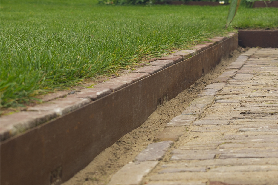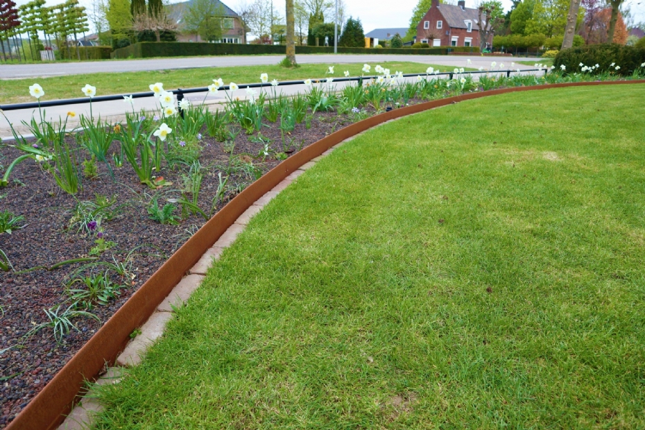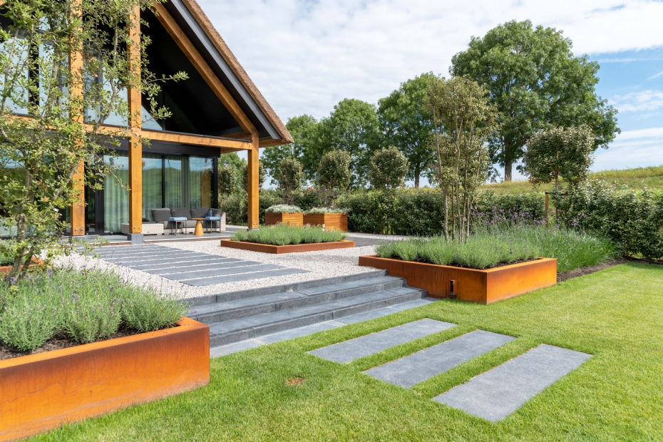 | | Hoogteverschillen kun je opvangen met verhoogde borderranden. Hier in een versie van cortenstaal van [LINK GIP 26716]Amevo[/LINK], ook verkrijgbaar in antraciet of rvs. |