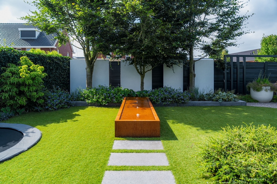 | | Een cortenstalen watertafel van [LINK GIP 18344]Adezz[/LINK] als blikvanger |