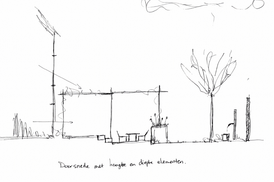 Poppelaars licht zijn schets toe: 'Via de pijl kijk je vanuit het raam over een pad van grote tegels naar het achterterras, met een zitset en een heg of muurelement erachter. Het groen links en rechts geeft hoogte en diepte. Dwars opgesteld staan twee verhoogde bakken van 40 cm met een boompje erin. De rondingen zijn buigbare borderranden van 10 cm. Via het zijraam rechts kijk je ter hoogte van de cirkel uit op een kunstobject of mooie pot als eyecatcher. Zo zie je vanaf een bank of bij een eettafel bij dat raam ook iets interessants.'