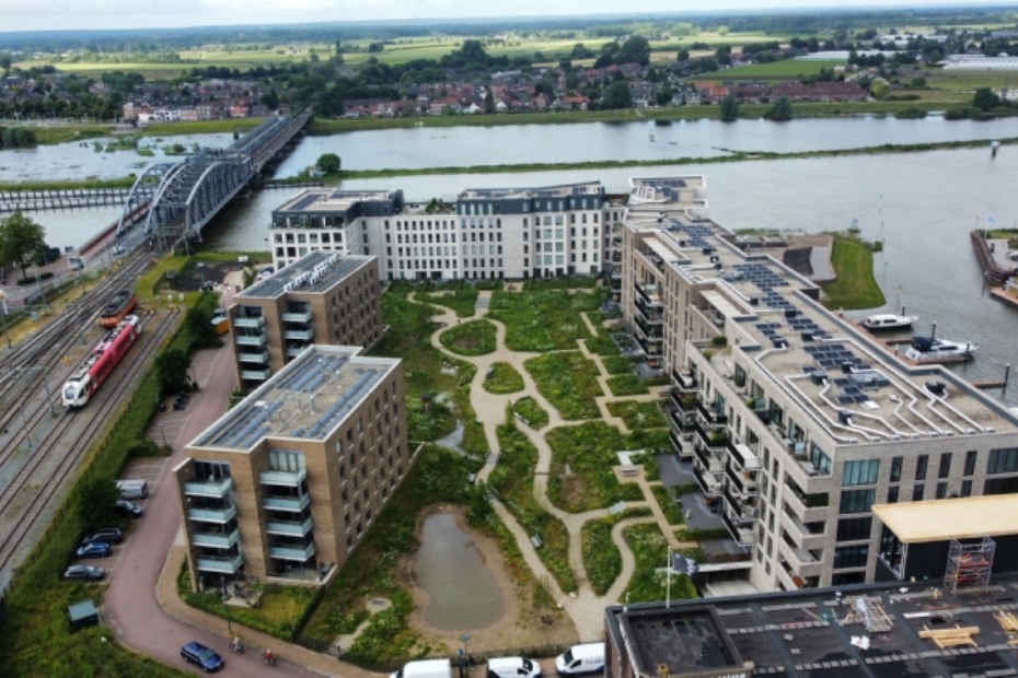 Grenzend aan de IJssel en een gezellige haven ligt de prachtige binnentuin van appartementencomplex Noorderhaven Kade Zuid. De gezamenlijke tuin van 5700 m2 bestaat deels uit volle grond en deels daktuin met waterretentie.