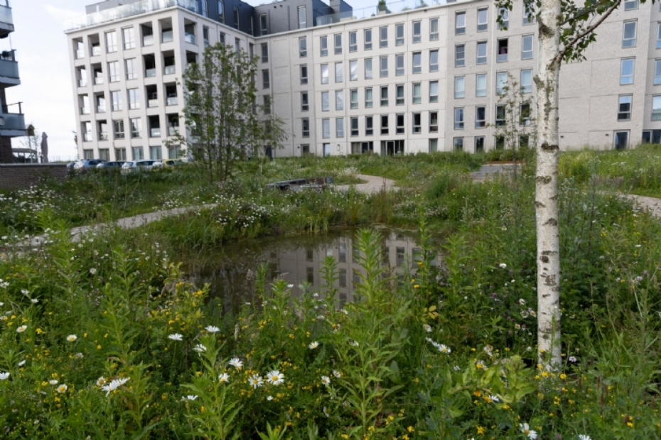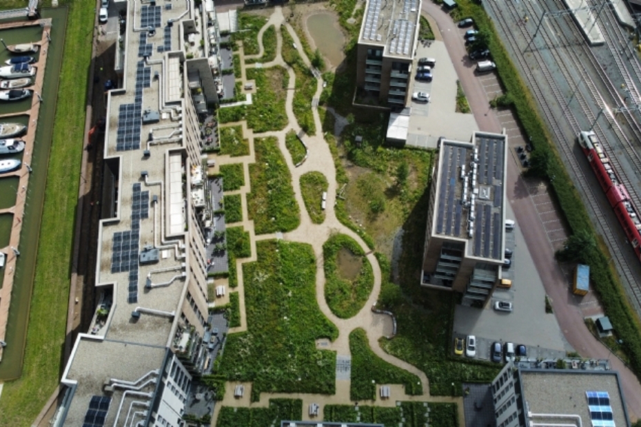 Klimaatadaptatie en biodiversiteit is hét thema van deze tuin. In de retentielaag van de daktuin wordt water opgeslagen en de wadi’s en beeklopen staan met elkaar in verbinding. Op deze manier is er een natuurlijk landschap gecreëerd die je kunt bewandelen via half verharde kronkelpaden. Er is geen afscheiding gemaakt tussen de terrassen van de bewoners wat het gevoel van een landschap, verbinding en beleving versterkt.