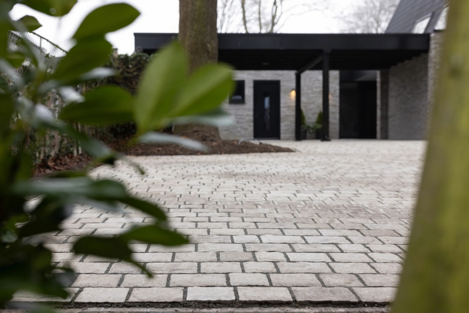 De Geosteen kasseistenen roepen het beeld op van oude Franse dorpspleinen en landweggetjes. Denk aan de kasseien die de wielerklassieker Parijs-Roubaix berucht maken. De 8-centimetervariant is waterpasserend, waardoor de nostalgische look goed samengaat met klimaatadaptatie. De stenen zijn sterk genoeg voor opritten en intensief gebruik, maar voelen door de gezandstraalde afwerking toch zacht en prettig aan. Spijker legt uit: 'Voor een oprit met kasseien leg je eerst een stabiele, waterdoorlatende fundering van 15-20 cm. Daarop komt een straatlaag van 3-5 cm, waarna je de kasseien in een lineair of rustiek wildverband plaatst. Ten slotte vul je de voegen met wit zand of een geschikt voegmiddel dat je zachtjes insproeit zodat het zich kan zetten.'