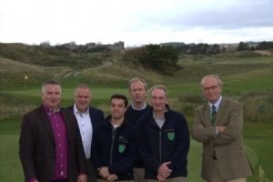 Op de foto van links naar rechts: Dennis Kramer (Meij de Bie Hoofddorp), Jan Plooij (Jean Heybroek), L.Simoes dos Santos assistent headgreenkeeper, Ir. A.P. Haverkamp Begemann, baancommissaris, D. Vastenhouw, headgreenkeeper, J.Gelderman, manager