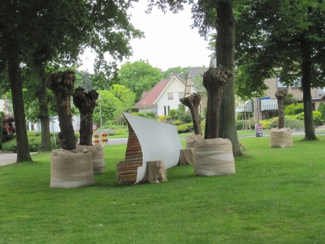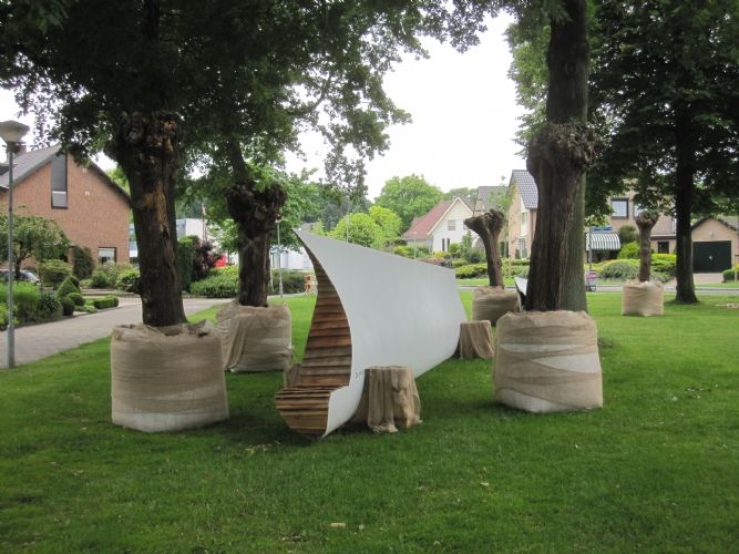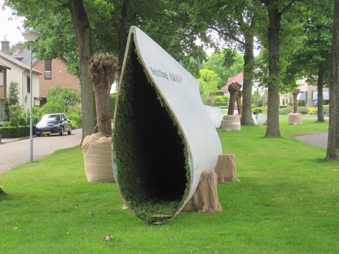 De troon van de toekomst Met dit element wordt verbeeld dat degene die plaatsneemt een blik in een groene duurzame toekomst wil werpen. De natuur is onderhevig aan veranderingen, we zullen dus steeds onze koers moeten aanpassen aan hetgeen onderweg gebeurt. Het is net als met de wind; de ene keer waait 'ie uit de ene hoek, dan weer uit een andere. We draaien gewoon mee en blijven het uitgestippelde pad naar een duurzame toekomst volgen. Gericht op het in balans brengen van ontwikkelingen in de buitenruimte met onze natuurlijke leefomgeving.