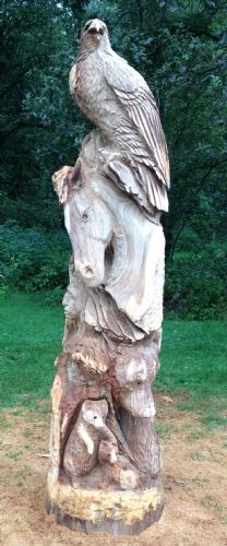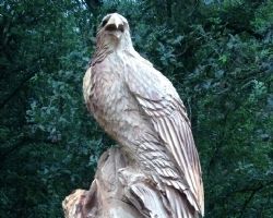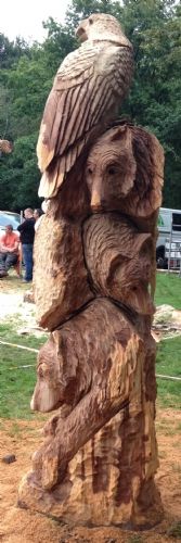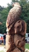 Een recordaantal deelnemers figuurzaagde drie kunstwerken, Sander’s fraaie zuil met dieren en een sierlijke adelaar bovenop won overtuigend. Voor dit werkstuk kregen de deelnemers twee dagen de tijd. Van de twee andere beelden moest binnen een half uur een sculptuur gemaakt zijn, het zogenoemde speedcarven. Broer Rik Boom veroverde daarbij de derde plaats. Sander’s carvingteam wordt gesponsord door Dolmar.