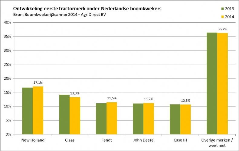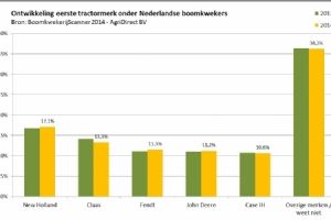 17,1% van de Nederlandse boomkwekers noemt New Holland als het meeste belangrijke tractormerk op het bedrijf. Claas volgt, net zoals vorig jaar, op een tweede positie met 13,3%. Fendt, John Deere en Case IH volgen op een respectievelijk derde, vierde en vijfde positie. Ruim 6 procent wil investeren in tractor