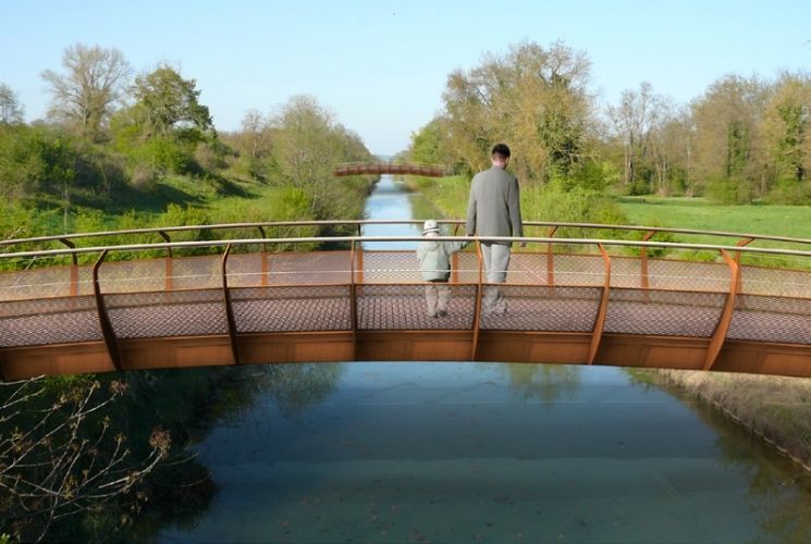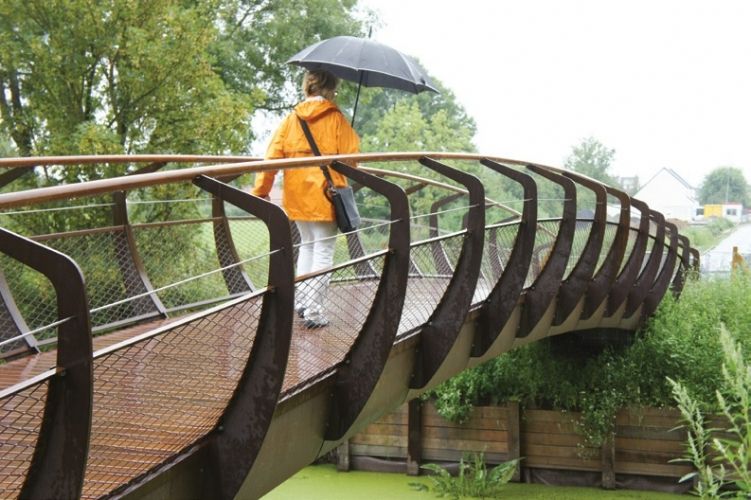 Samen met de architect Atelier Nervures en de aannemer Idverde agence de Bouchain zijn de details van de brug uitgekristalliseerd. Het FSC hardhout in combinatie met het roestige Corten staal geeft een warme indruk. Het wijd gebogen hekwerk creëert een brede toegang en een vriendelijke uitstraling. De brug is daardoor subtiel in het landschap aanwezig.