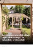 Douchescherm van Schellevis-tegels als blikvanger in natuurlijke wellnesstuin